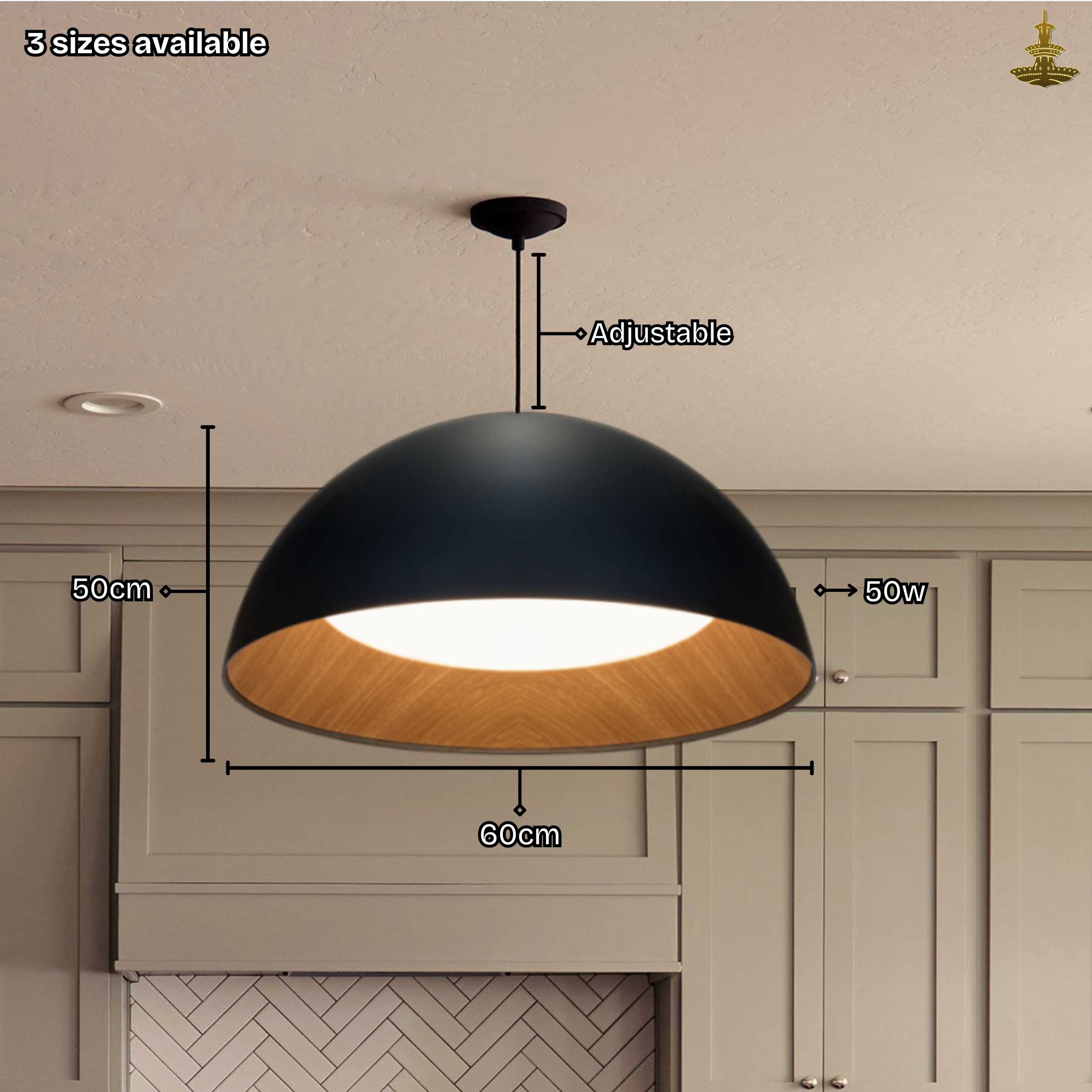 Available in three sizes—40cm (28W), 50cm (40W), and 60cm (50W)—this chandelier offers flexibility to suit different room sizes while ensuring energy-efficient lighting.
